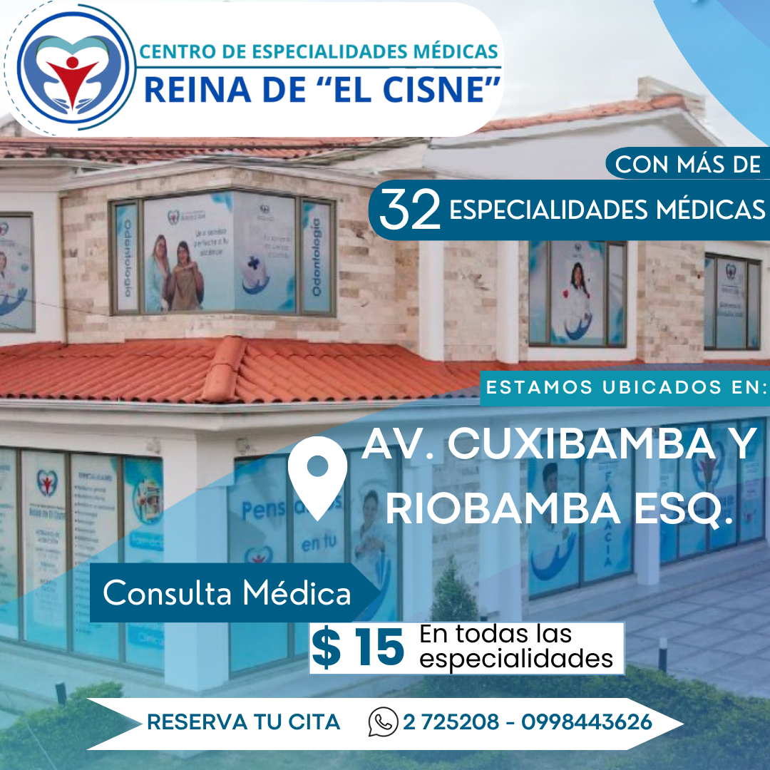 El Centro de Especialidades Médicas Reina de El Cisne, se encuentra ubicado en la Av. Cuxibamba 65-09 y Riobamba Esq. En un sector estratégico y de fácil acceso, brinda un servicio de alta calidad médica y tecnología moderna. Catalogado como Centro de Especialidades Médicas de segundo nivel, el centro cuenta con todas las normas técnicas vigentes establecidas por el Ministerio de Salud Pública del Ecuador.